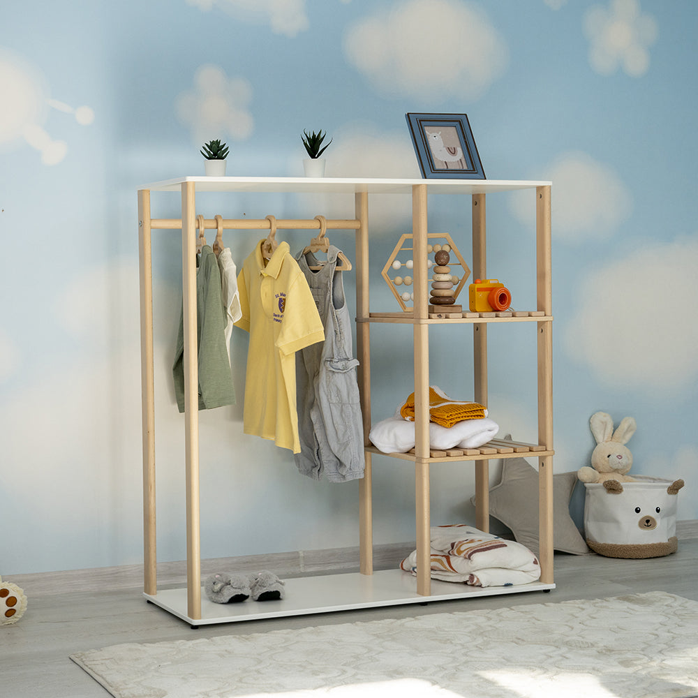Cette armoire pour tout-petits est bien plus qu'un simple meuble : c'est un outil pédagogique. En disposant d'un espace dédié pour leurs vêtements et leurs jouets, les enfants apprennent l'importance de l'organisation et du rangement dès leur plus jeune âge. La conception ouverte de l'armoire encourage les enfants à développer leurs propres systèmes de rangement et de récupération de leurs objets, favorisant ainsi un sentiment d'indépendance et de responsabilité.