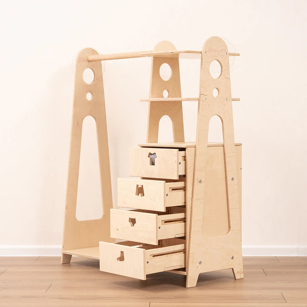Inspirés des idées Montessori, nos meubles permettent d'apprendre aux petits enfants à plier leurs vêtements et leurs chaussures et d'améliorer leurs capacités d'organisation.